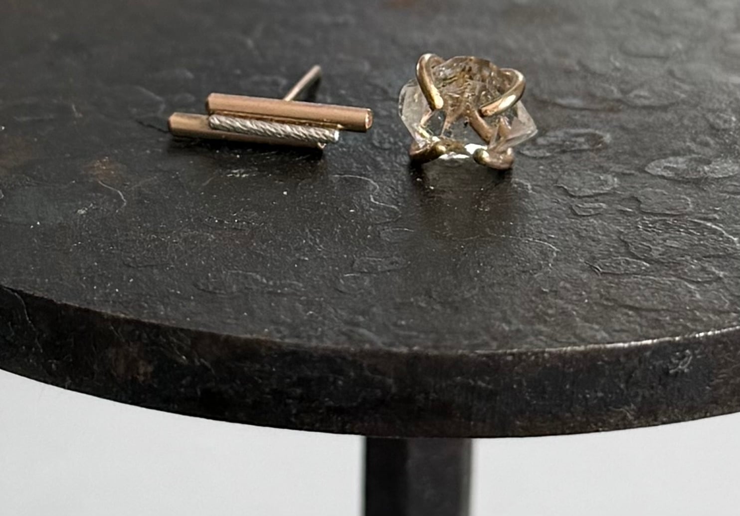 透明感のあるオイルインクォーツの原石ピアスと、シャープなバーピアスを合わせた軽やかなアシンメトリーの組み合わせ。